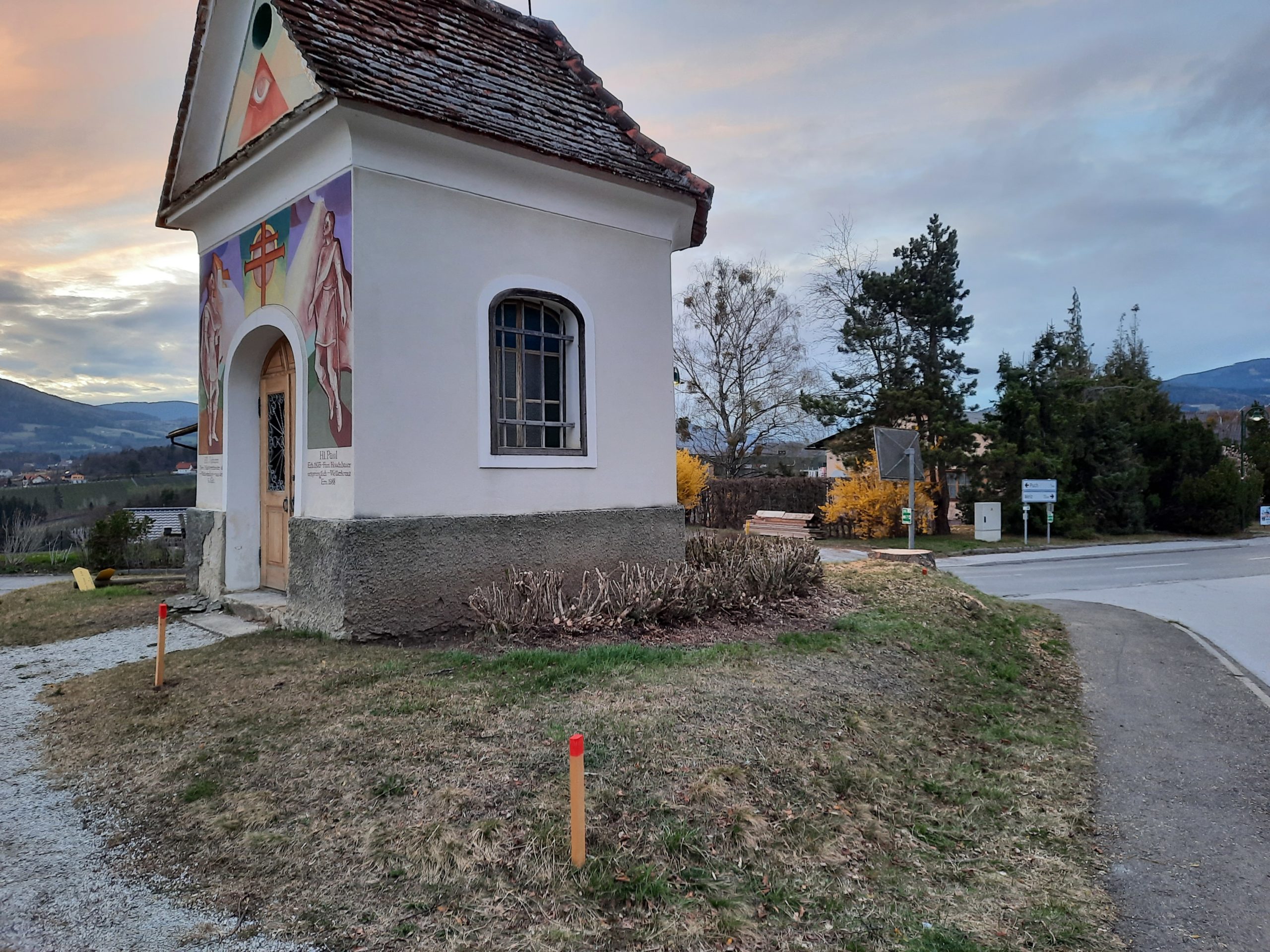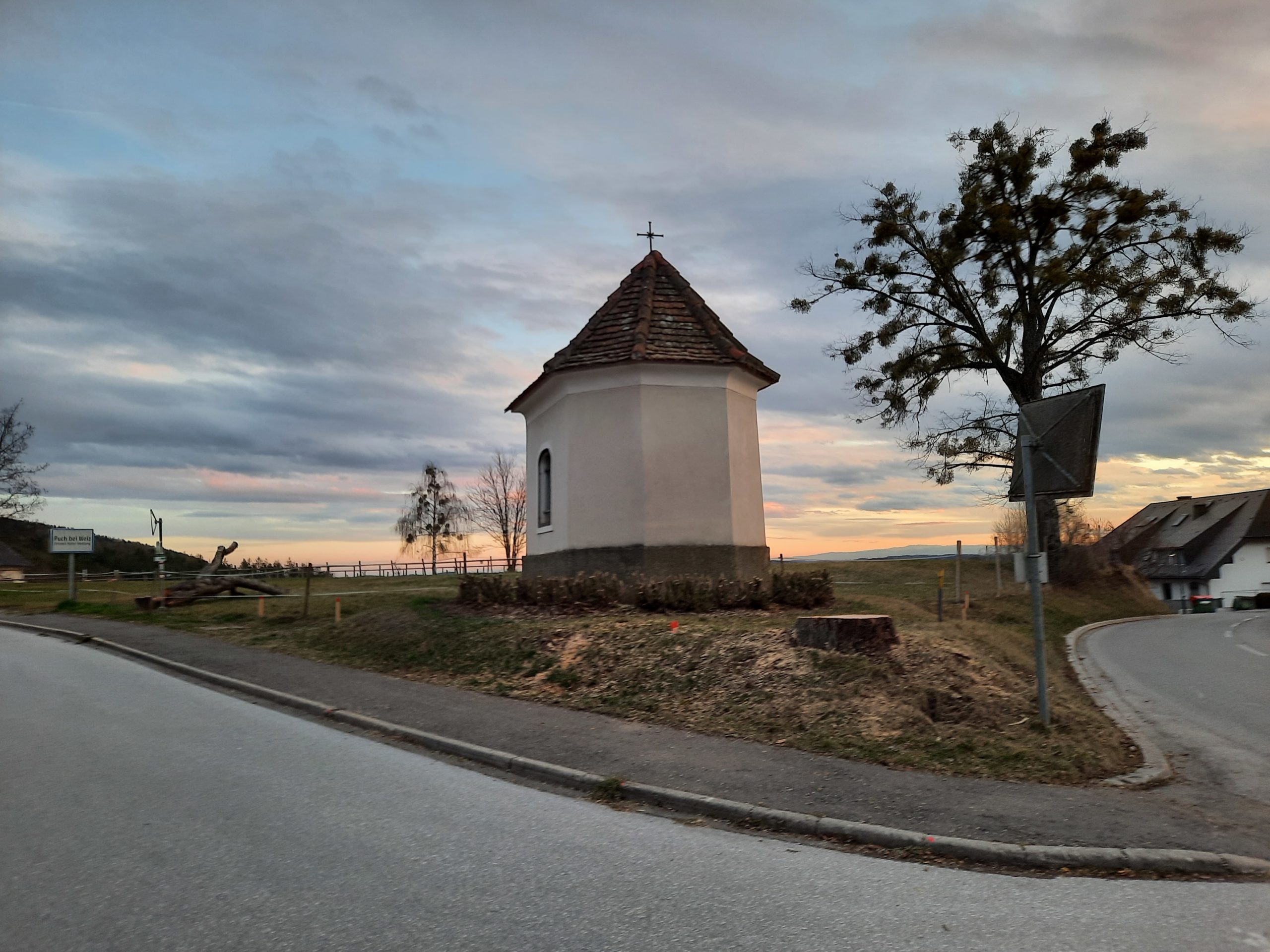 Sie stand an einer Kreuzung vor einer Kapelle der Wetterheiligen.