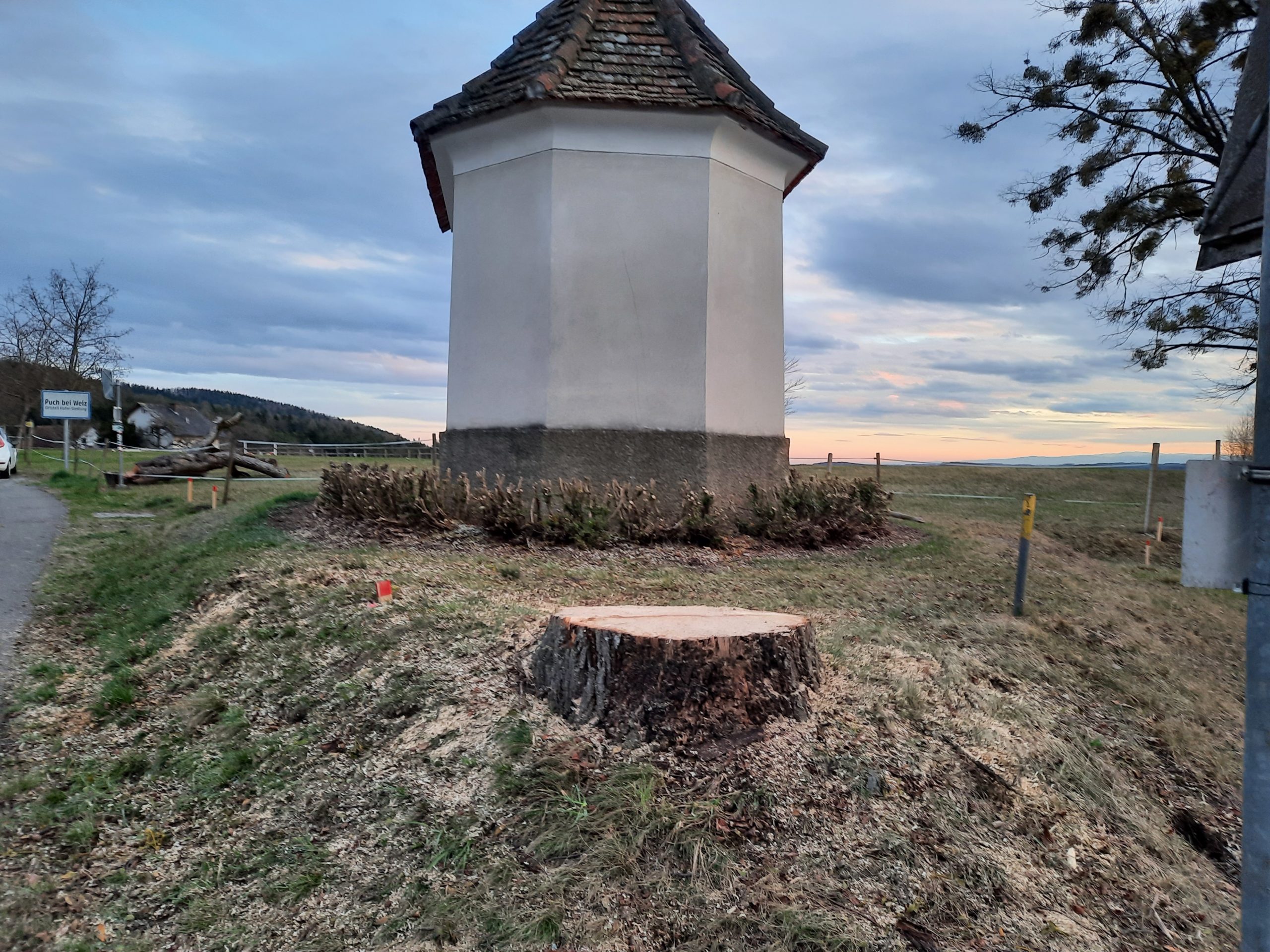 Die uralte, ehrwürdige Hoanbauern-Linde wurde tatsächlich gefällt. Und dies gefällt sicher nicht! Kam bei der Neuvermessung der Straße heraus, dass dieser mütterliche Baum, der das Bild der Kapelle geprägt und die Verbundenheit zwischen Glaube und Natur verkörpert hatte, zur Straße gehörte? Sieht es auf diesem Bild so aus, als wäre die Linde auf der Straße gestanden? Ich denke nicht! Der Baum war zuerst da gewesen und jetzt ist er weg.